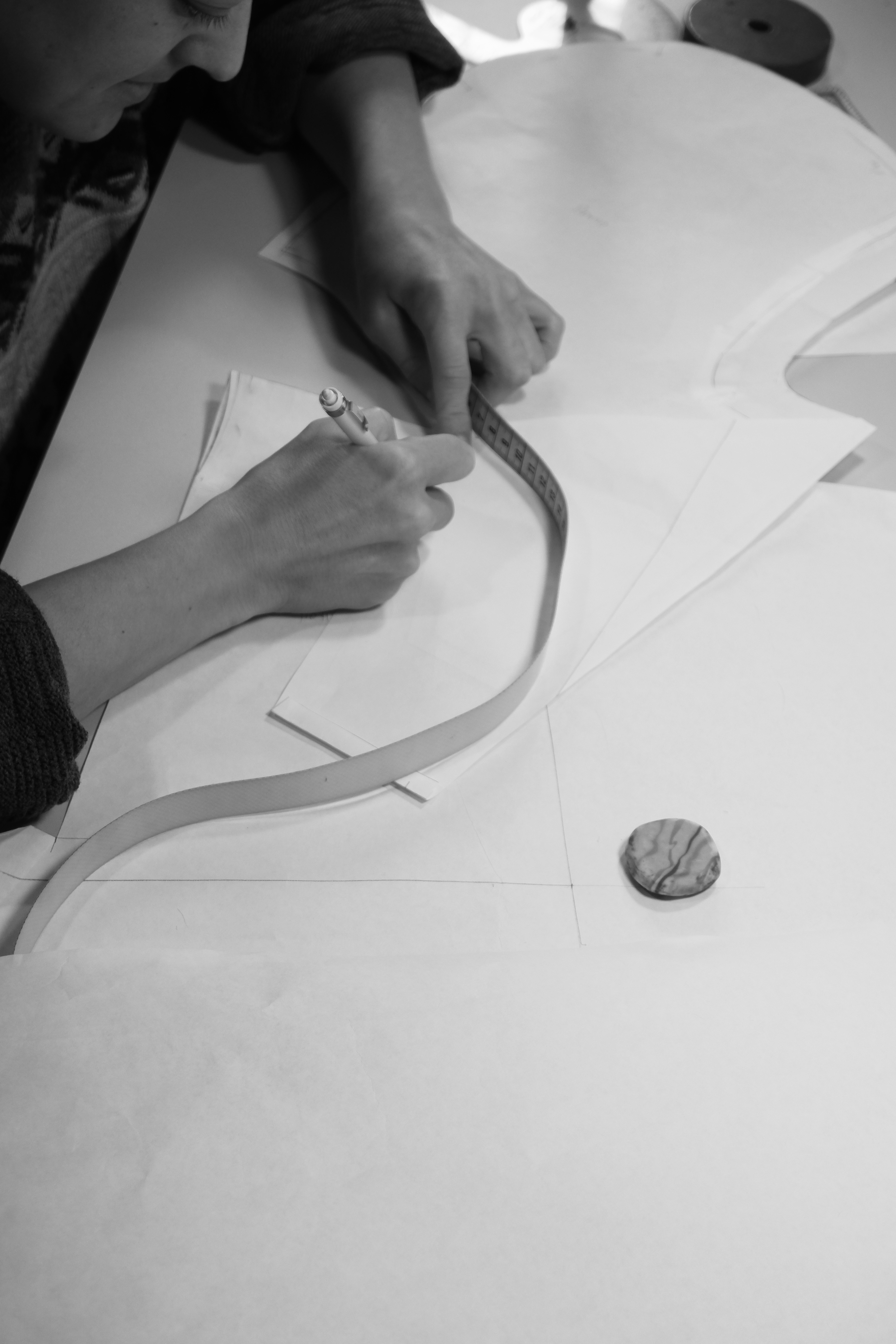 Около года разрабатывались лекала, каждую конструкцию и макет я создала своими руками, выверяя пропорции, проводя сотни примерок макетов. После того, как была наработана база лекал, первые образцы пальто и технология их изготовления были созданы совместно с моими ученицами, которые на тот момент были участницами сборной.
